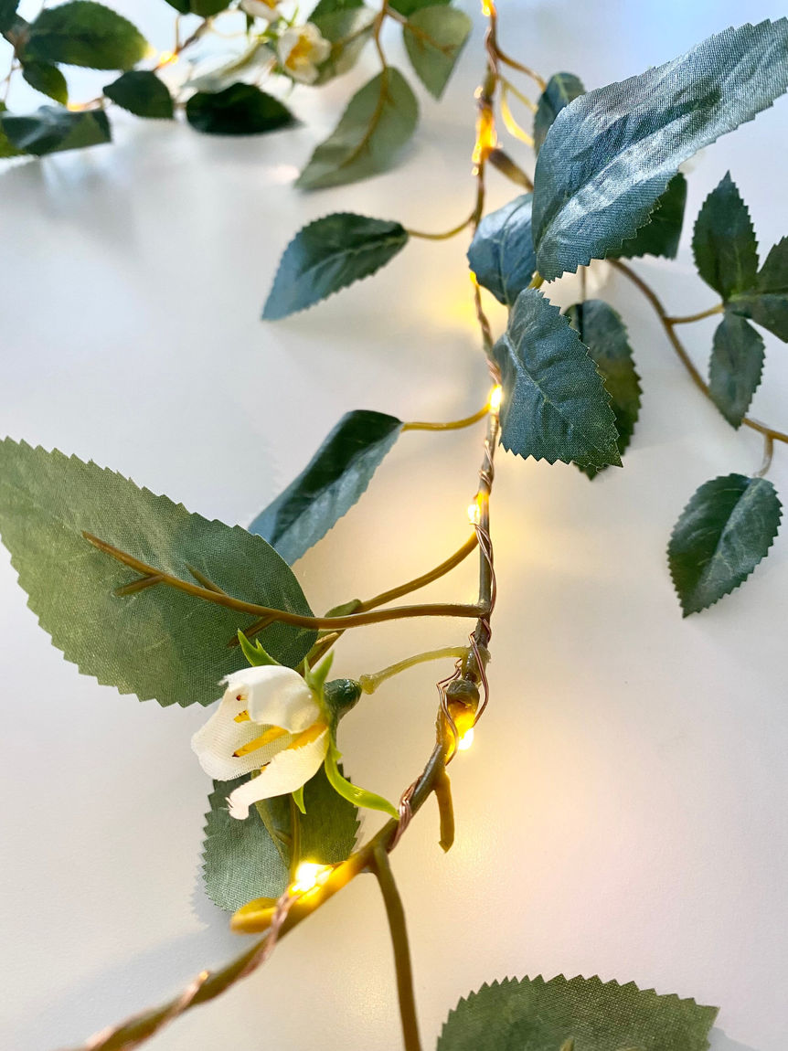 Transform your bedroom into an enchanting place of beauty with this string light garland. Featuring pretty leaves, glowing fairy lights and a scattering of small white flowers, this feminine vine is just gorgeous. The warm glowing lights add a romantic feeling to any space. The vine can be draped over a bed head, run along the dresser or hung over a mirror to double the glow. Your bedroom will be a place of femininity and calm with the addition of this pretty garland.